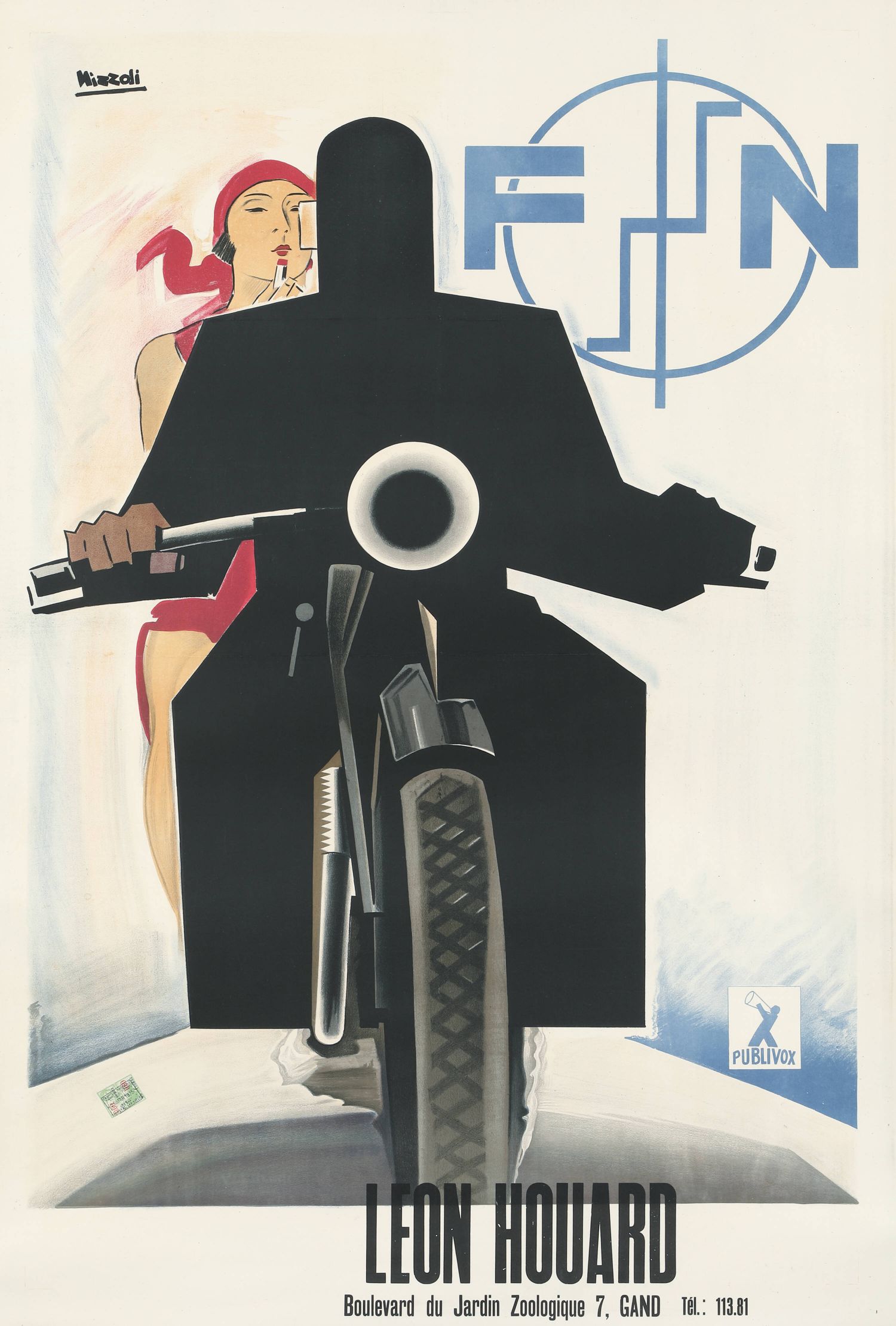 El cartel muestra una composición dinámica con figuras masculina y femenina, destacando el estilo elegante y moderno de la época. Incluye la firma de Nizzoli y detalles de la publicación. FN, una empresa belga conocida por armas de fuego, también fabricaba motocicletas de alta calidad. Este póster es un excelente ejemplo del arte publicitario de principios del siglo XX.