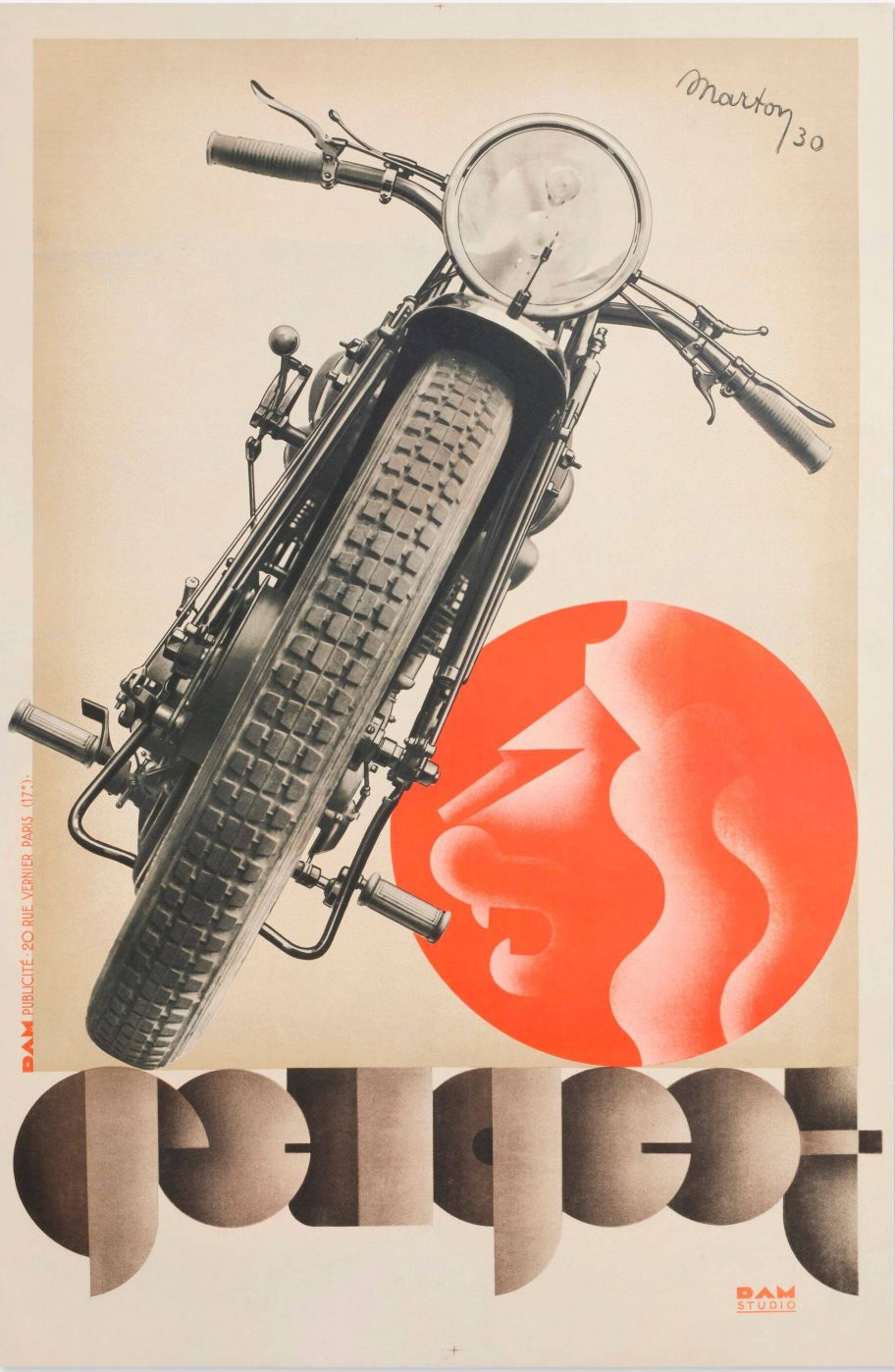 Este póster publicitario de estilo Art Déco para motocicletas, creado por el artista húngaro Lajos Marton (1891–1952) en 1930, para la reconocida marca Peugeot.