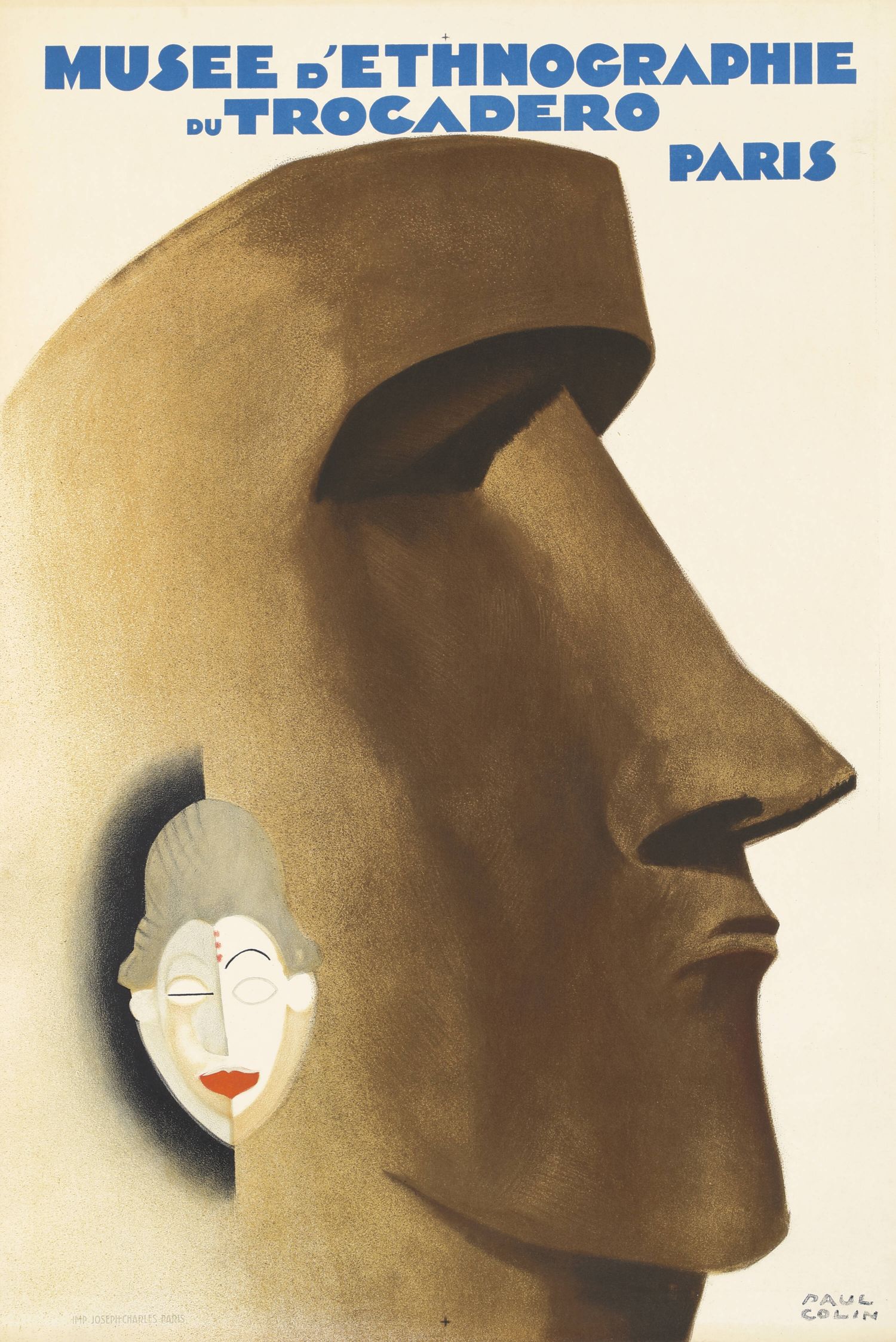 El cartel Museo Etnográfico del Trocadero ('Musée d'Ethnographie du Trocadéro', en francés) de Paul Colin es una obra Art Déco que promociona el museo. Colin, reconocido por sus diseños teatrales, aquí destaca elementos de arte africano y oceánico, como una máscara Punu y una estatua Moai. Este trabajo muestra la versatilidad de Colin al aplicar su estilo distintivo a temas culturales y museísticos..