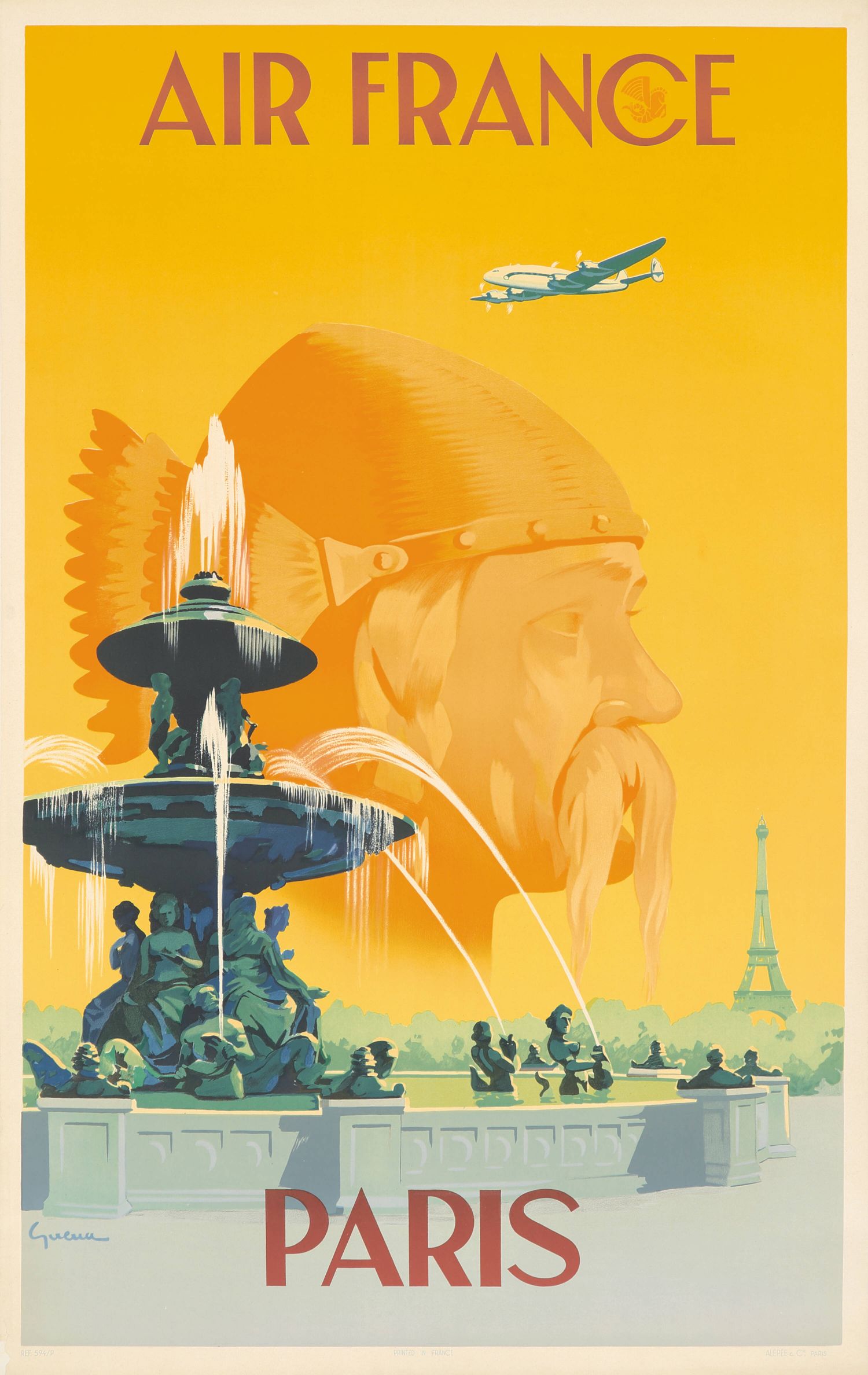 Este cartel de viaje vintage de Air France, creado por Vincent Guerra en 1949, lleva por título "París tiene dos mil años". Diseñado en un período de creciente interés por los viajes tras la Segunda Guerra Mundial, invita a explorar la rica historia y el encanto atemporal de la capital francesa. El póster presenta elementos icónicos como una fuente, una figura con casco (simbolizando historia o cultura) y la Torre Eiffel al fondo, todo junto a un avión de Air France, destacando la conexión aérea con esta milenaria ciudad.