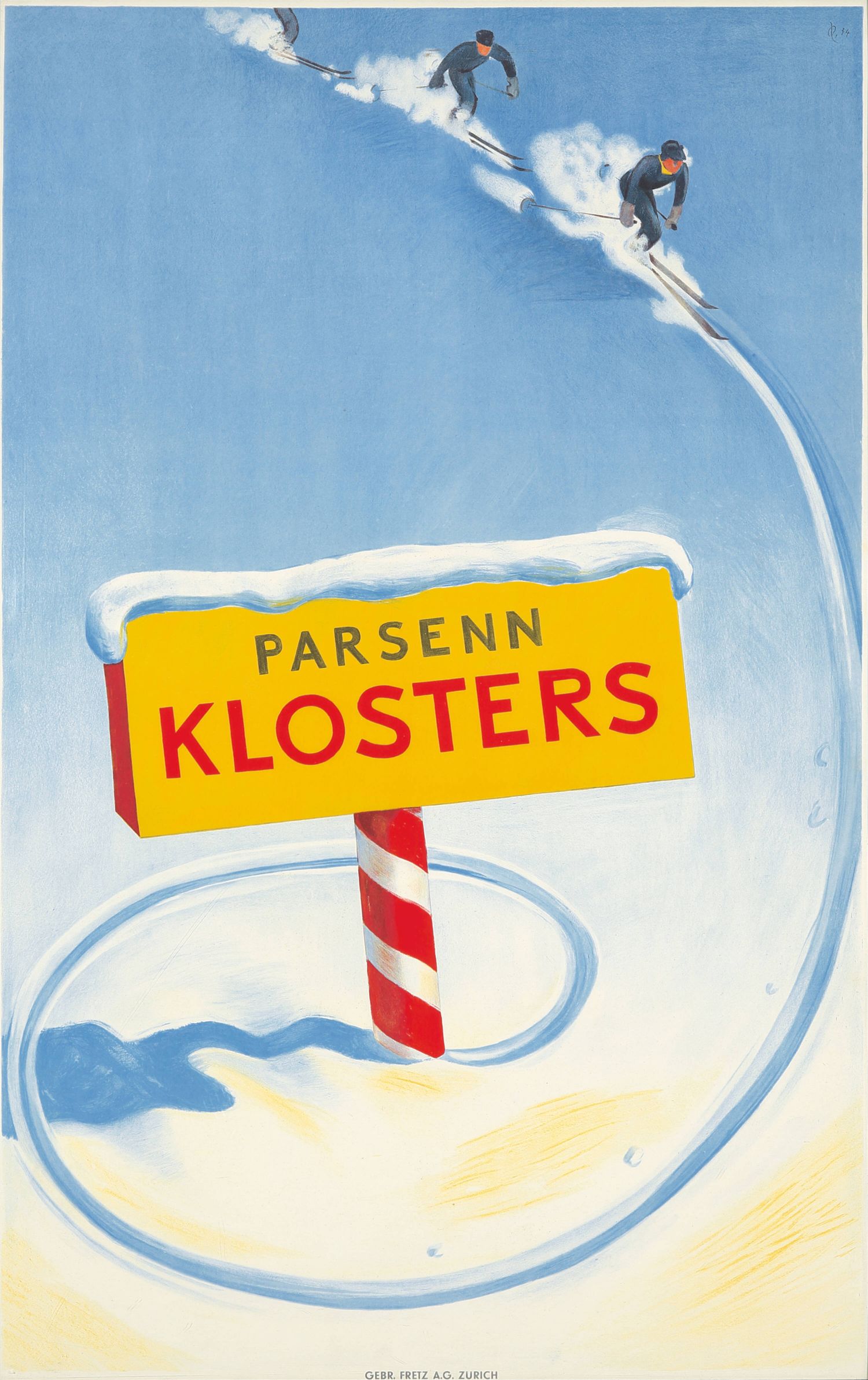 El cartel muestra a tres esquiadores descendiendo por las laderas nevadas hacia un letrero con los nombres "Parsenn" y "Klosters". Esta litografía, impresa por Gebr. Fretz AG, Zúrich, es una pieza poco común, siendo uno de los pocos carteles de Klosters que aún se conservan.