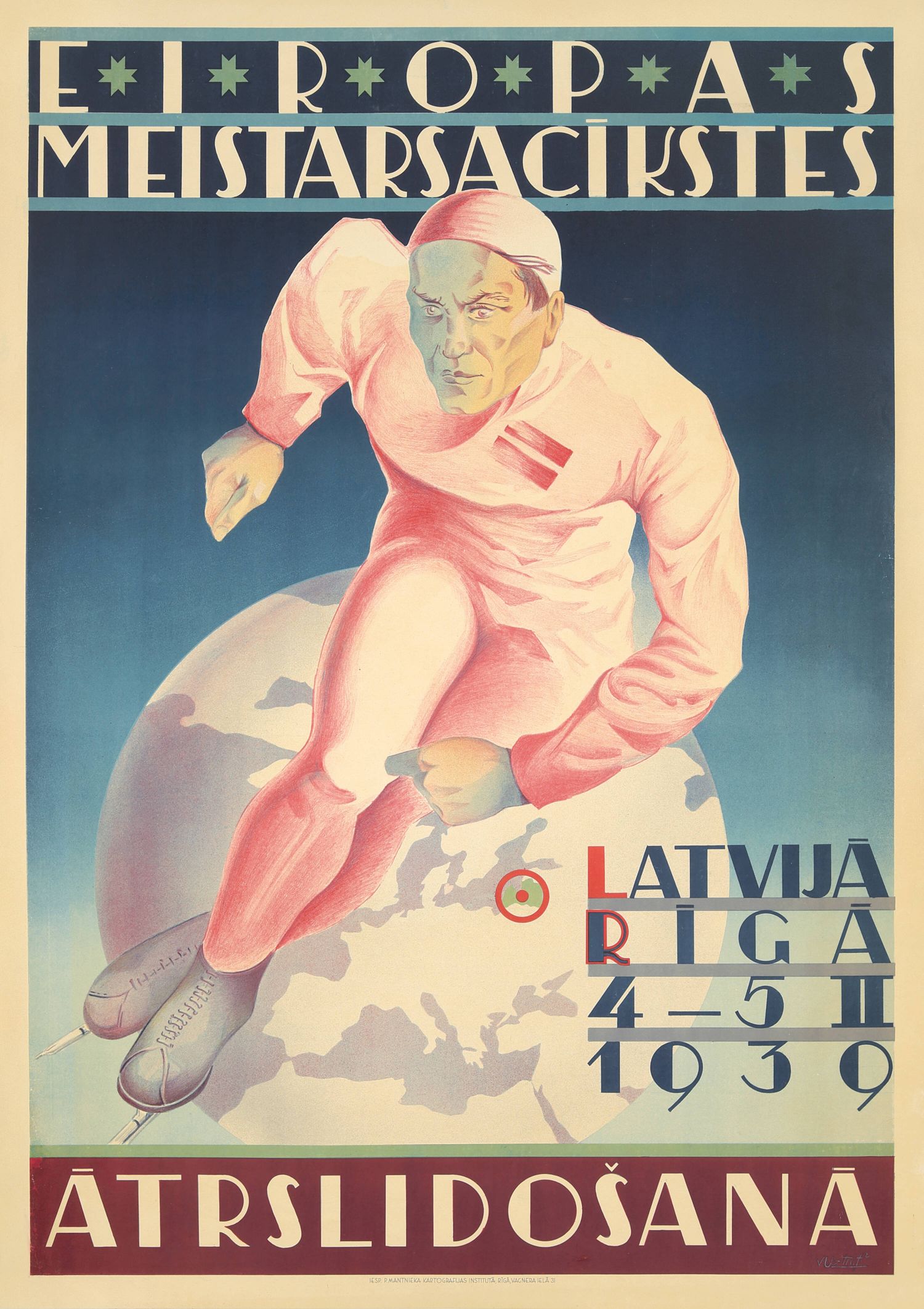 Este cartel anuncia el "Eiropas Meistarsacīkstes Ātrslidošanā" (Campeonato Europeo de Patinaje de Velocidad) de 1939, un evento que tuvo lugar en Riga, Letonia, los días 4 y 5 de febrero. El diseño presenta a un patinador de velocidad en plena acción sobre un globo terráqueo, simbolizando el alcance europeo y la magnitud de este campeonato.