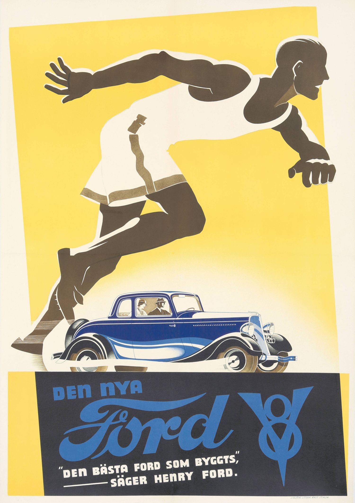 El cartel presenta un diseño dinámico con un corredor atlético en la parte superior, simbolizando la velocidad y el rendimiento, mientras que un elegante automóvil Ford V8 azul se sitúa en la parte inferior. El texto en sueco, "DEN NYA Ford V8" (El Nuevo Ford V8) y ""DEN BÄSTA FORD SOM BYGGTS," SÄGER HENRY FORD." ("El mejor Ford jamás construido", dice Henry Ford), resalta la calidad y la innovación del vehículo.
