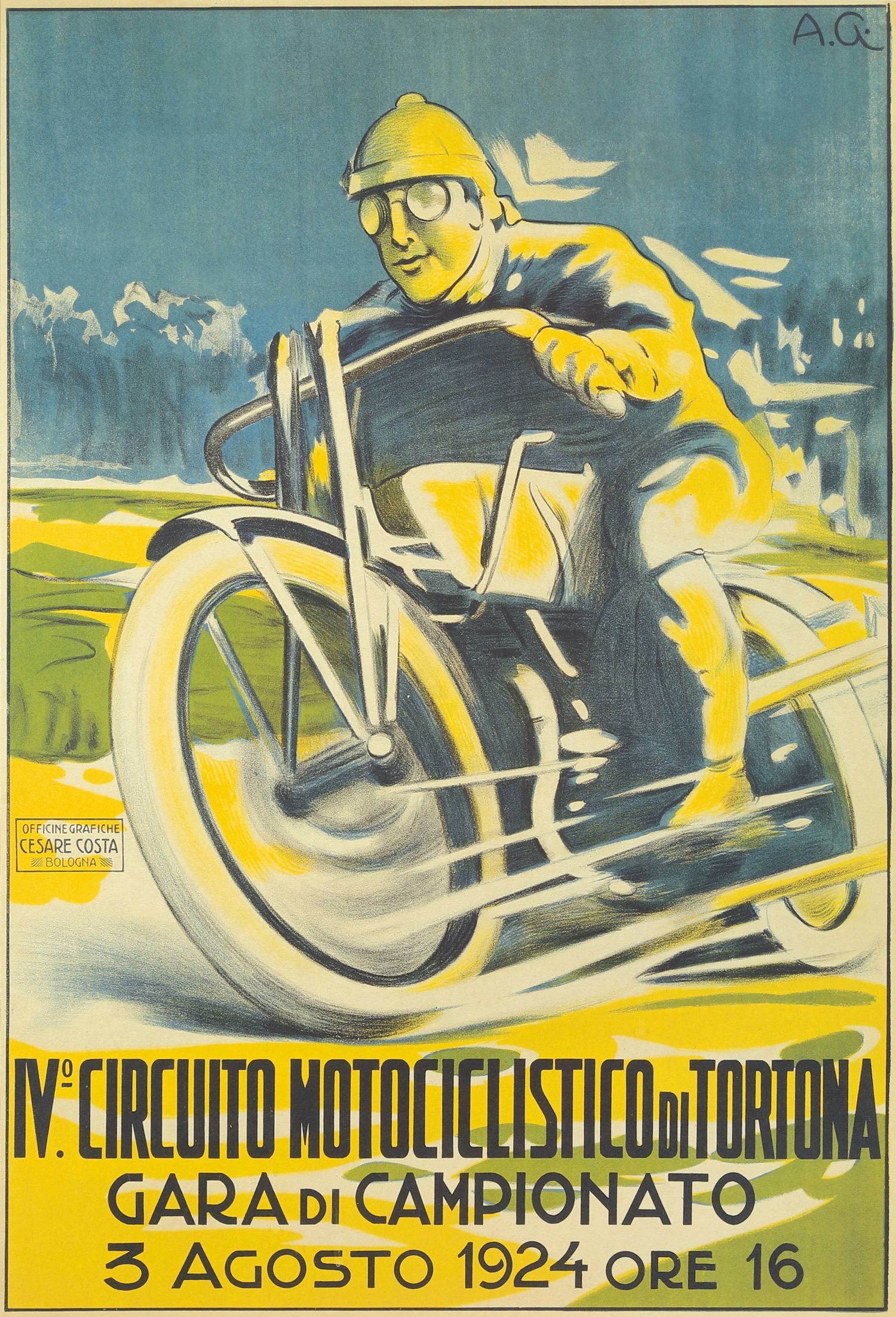 P óster p ublicitario vintage que anuncia el " IV Circuito Motociclístico de Tortona ", una carrera de motocicletas. La carrera se celebró…