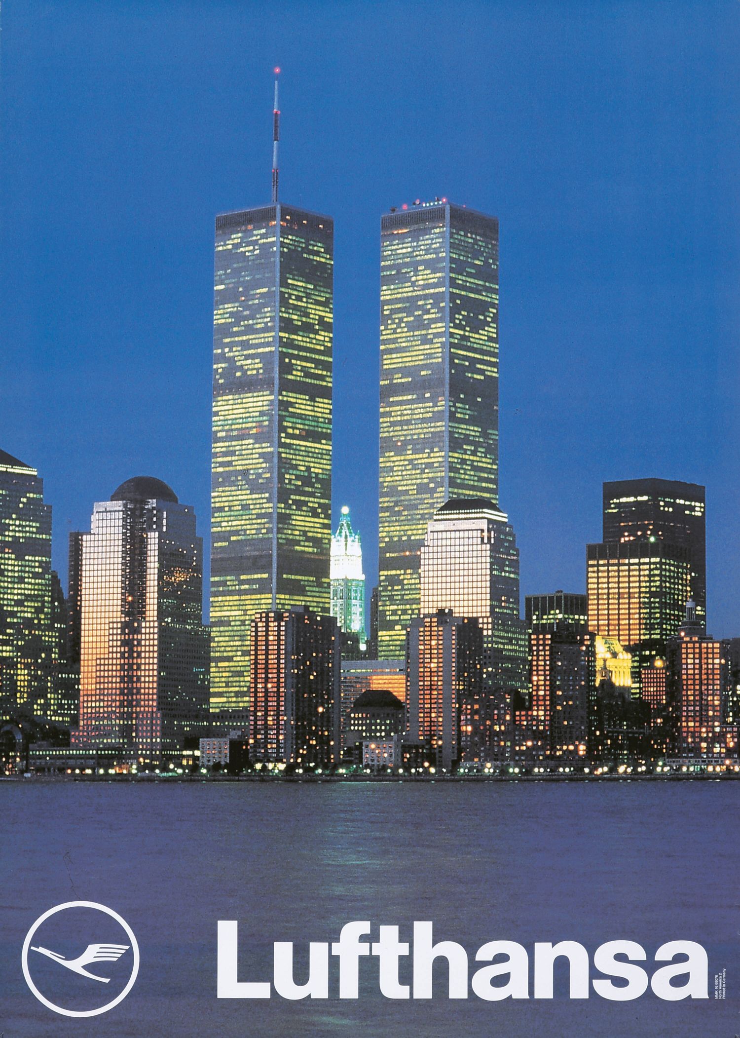 Este póster vintage de Lufthansa captura la majestuosidad de las icónicas Torres Gemelas del Bajo Manhattan, en el momento justo antes de la noche neoyorquina. La obra muestra los imponentes rascacielos bajo un cielo crepuscular, con el nombre de la aerolínea posicionado en la parte inferior. Este cartel no solo promocionaba los vuelos de Lufthansa a la vibrante Ciudad de Nueva York, sino que también inmortalizó un paisaje urbano que se convirtió en un símbolo global, hoy cargado de un profundo significado histórico y emocional.
