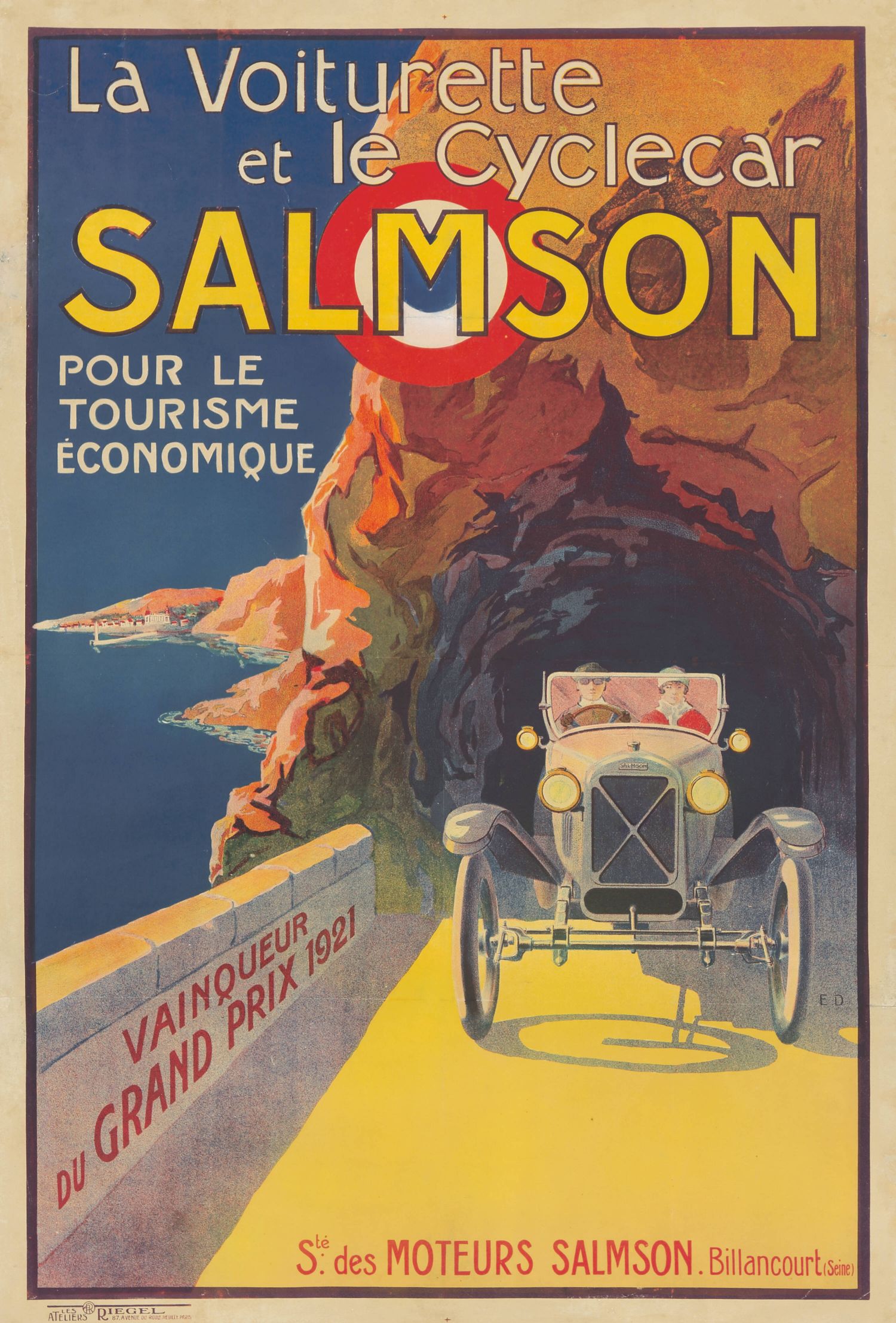 El cartel destaca que Salmson fue el ganador del Gran Premio de 1921, lo que indica su éxito en el automovilismo de la época. La imagen muestra un automóvil Salmson conduciendo a lo largo de una carretera costera con un túnel, evocando la libertad y el placer de viajar. La empresa "S. des MOTEURS SALMSON" tenía su sede en Billancourt.
