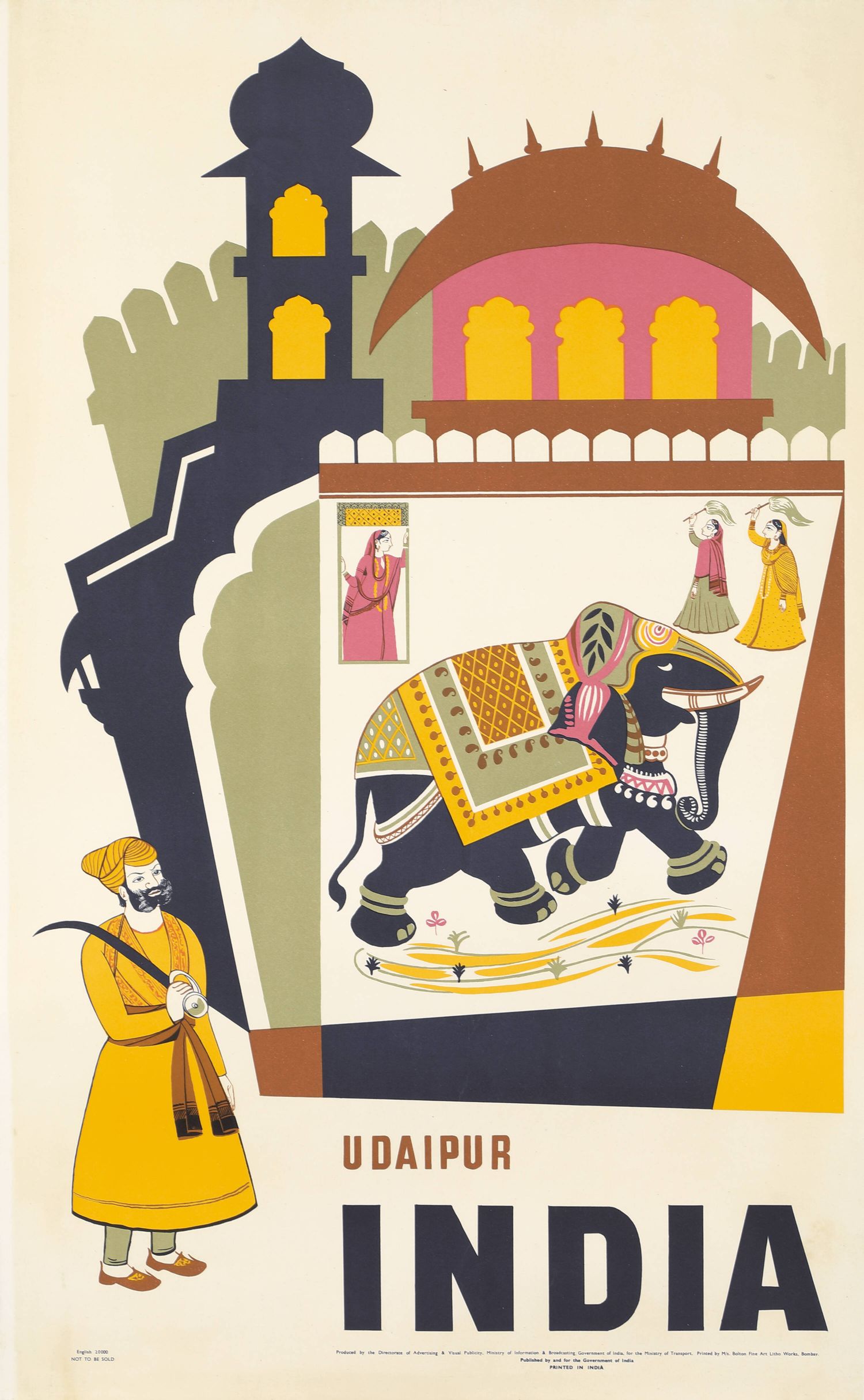 Este cartel de viaje vintage promociona Udaipur, India, empleando colores vibrantes, tipografía audaz e ilustraciones estilizadas, típicas…