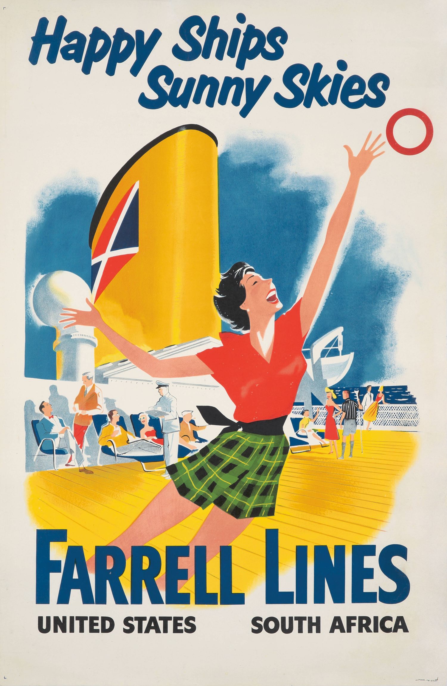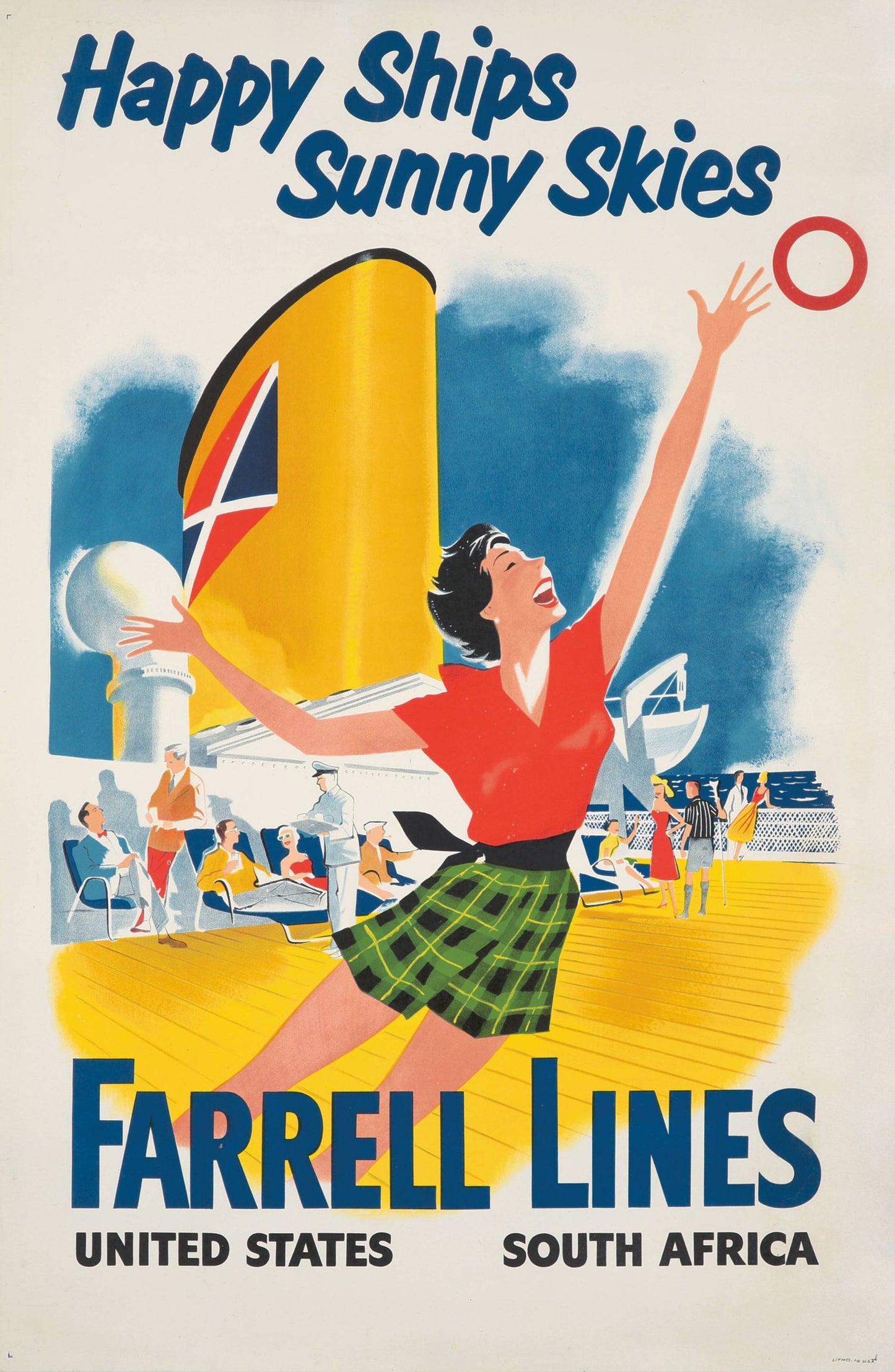 Este póster vintage anuncia 'Farrell Lines', una compañía naviera que conectaba Estados Unidos y Sudáfrica (incluyendo Ciudad del Cabo, Port Elizabeth, Durban y Maputo). El póster, creado para atraer pasajeros, resalta el aspecto placentero y lujoso del viaje a bordo de sus buques, equipados para unos 180 pasajeros. La representación visual sugiere actividades a bordo, enfatizando un trayecto agradable a pesar de la larga distancia.