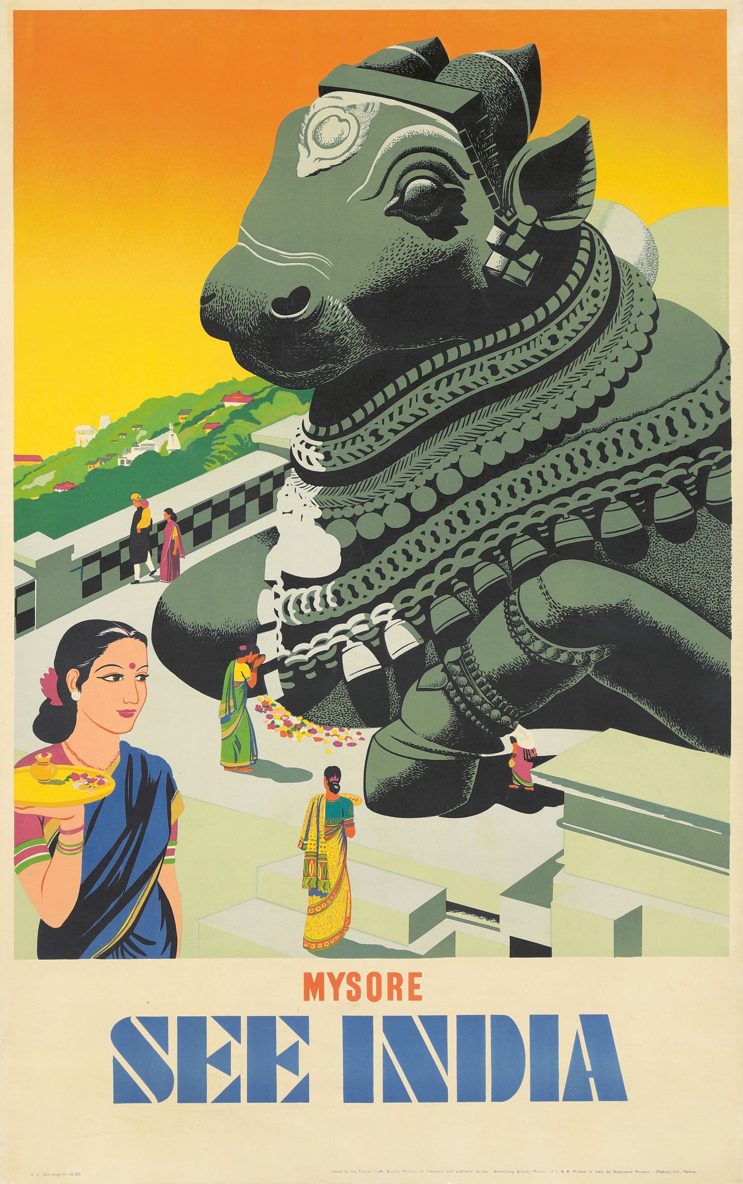 Póster de viaje antiguo del Ministerio de Transporte de la India promociona Mysore, Karnataka, como un destino cautivador. El póster destaca con una representación vibrante de la estatua monolítica de Nandi. Ubicada en las faldas de las colinas de Chamundi, esta estatua de más de 350 años fue esculpida durante el reinado de Dodda Devaraja Wadiyar. Es una atracción importante de Mysore, conocida por su rica herencia y su impresionante arquitectura.