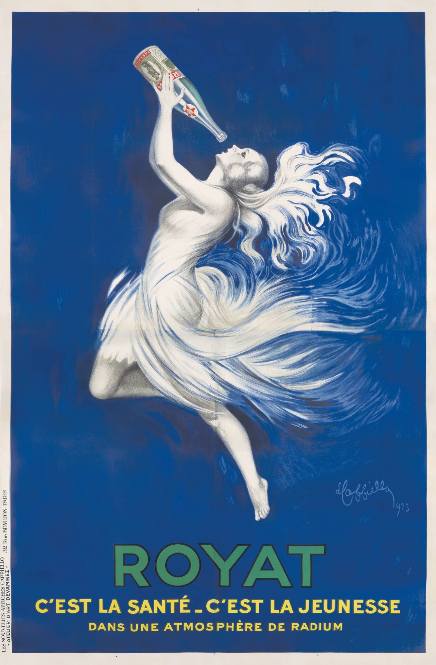 La ilustración muestra una figura femenina etérea bebiendo de una botella, simbolizando la vitalidad y la belleza que se atribuyen a los tratamientos en Royat. El estilo vibrante y distintivo de Cappiello es evidente en esta obra, que combina su toque artístico con la calidad de impresión de Devambez.
