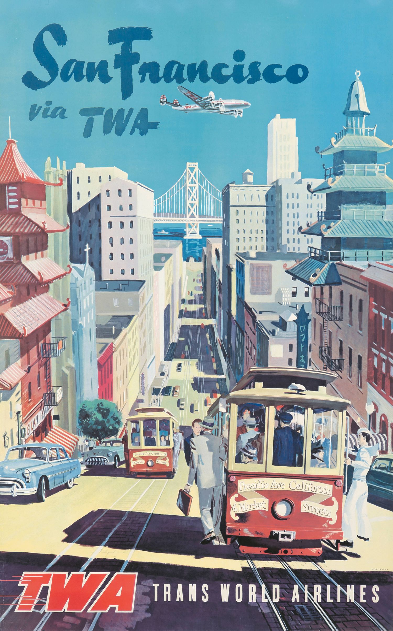El cartel destaca elementos emblemáticos de San Francisco como los tranvías, la arquitectura del barrio chino y el Puente de la Bahía, con un avión de TWA sobrevolando.