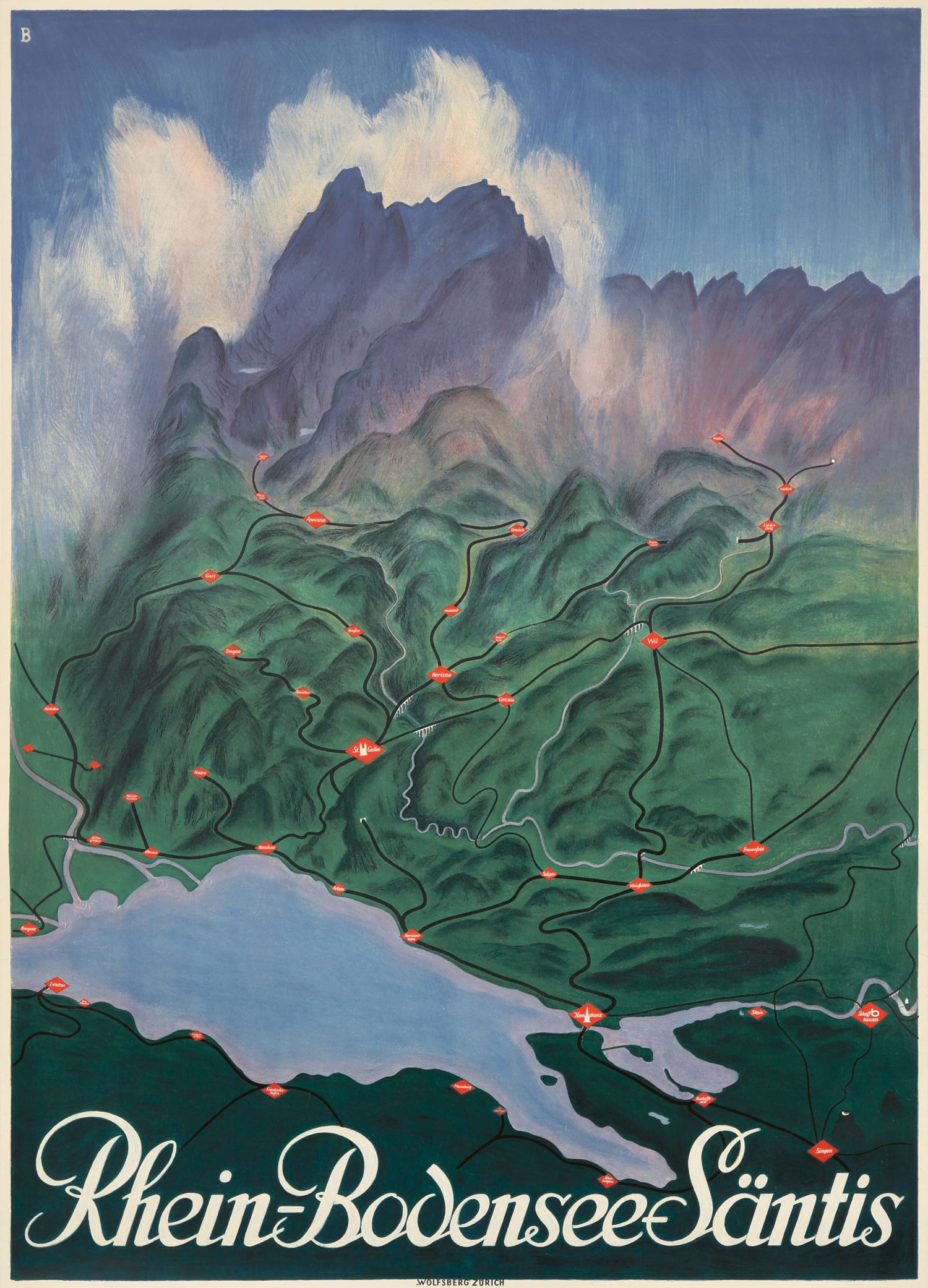 Este cartel de Otto Baumberger es una representación artística del macizo de Säntis en los Alpes suizos, destacando la región circundante que incluye el Lago de Constanza (Bodensee) y el río Rin (Rhein). El Säntis, con 2.502 metros, es el pico más alto del macizo de Alpstein y ofrece vistas panorámicas de seis países. El Bodensee es un gran lago compartido por Suiza, Alemania y Austria, mientras que el Rin es un río europeo vital que fluye desde los Alpes suizos pasando por el lago. Este cartel vintage promociona el turismo en esta pintoresca área montañosa y lacustre de Suiza.