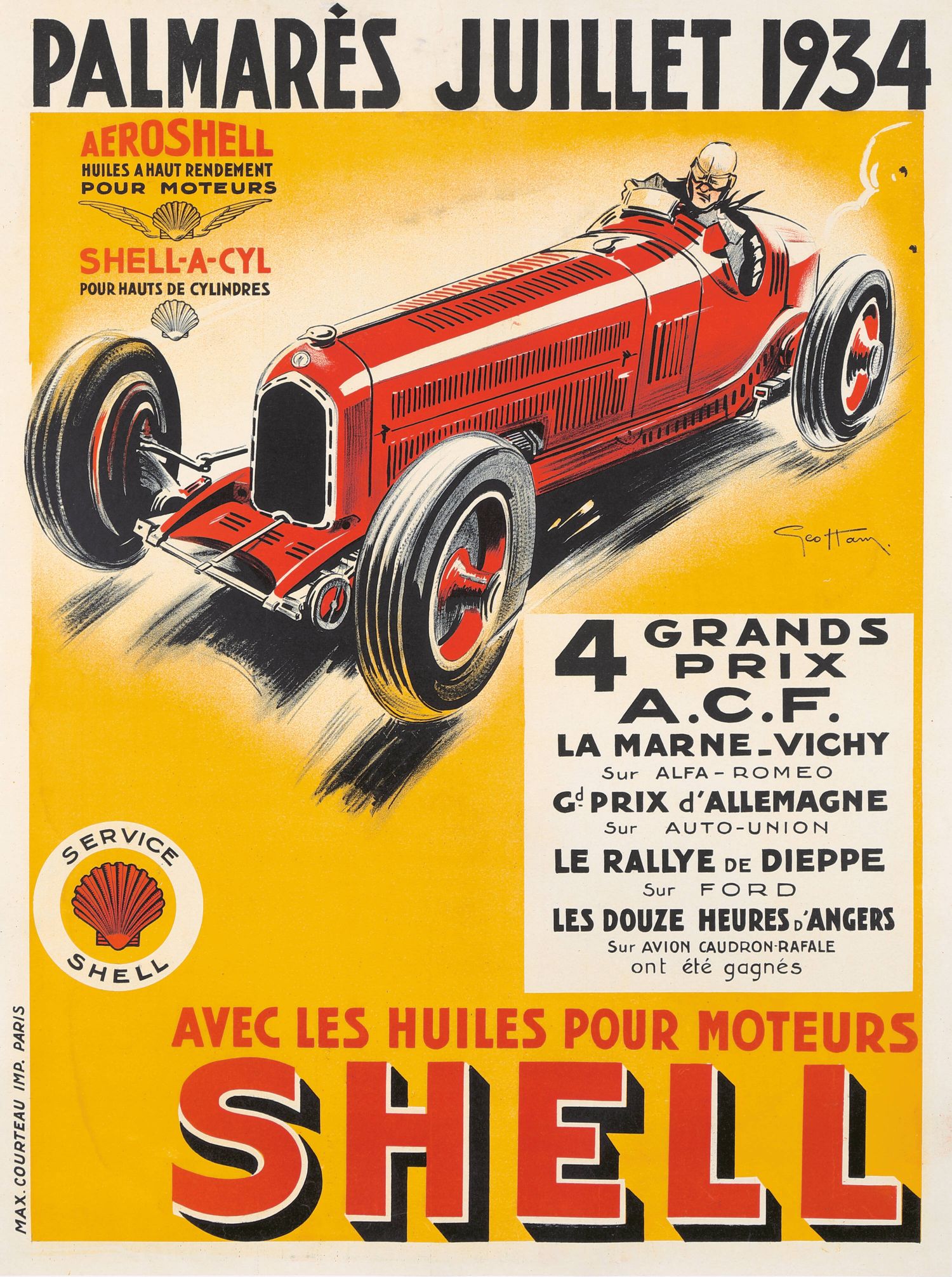 Este póster vintage de Shell Oil, creado en 1934 por el reconocido artista francés Géo Ham (Georges Hamel, 1900-1972), celebra las victorias de la marca en diversas carreras importantes de ese año.