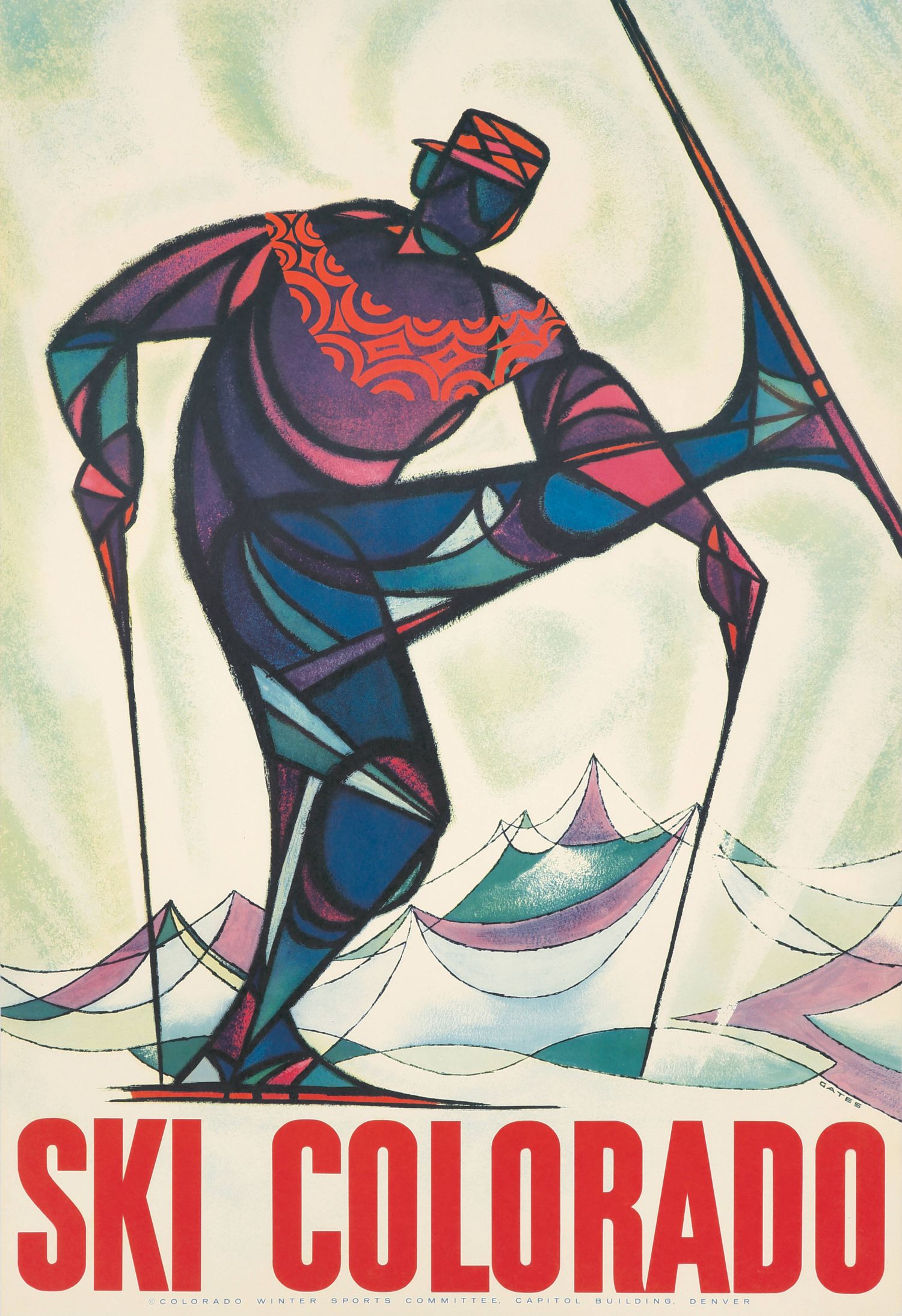 Este cartel vintage "Ski Colorado" de Red Gates, es de alrededor de 1957, destaca por su estilo Mid-Century Modern y geométrico. Diseñado para el Comité de Deportes de Invierno de Colorado, presenta a un esquiador estilizado con colores brillantes y una representación abstracta del esquí. En este caso estamos ante un ejemplo notable de la publicidad de esquí de la época, mostrando el atractivo de Colorado como destino.