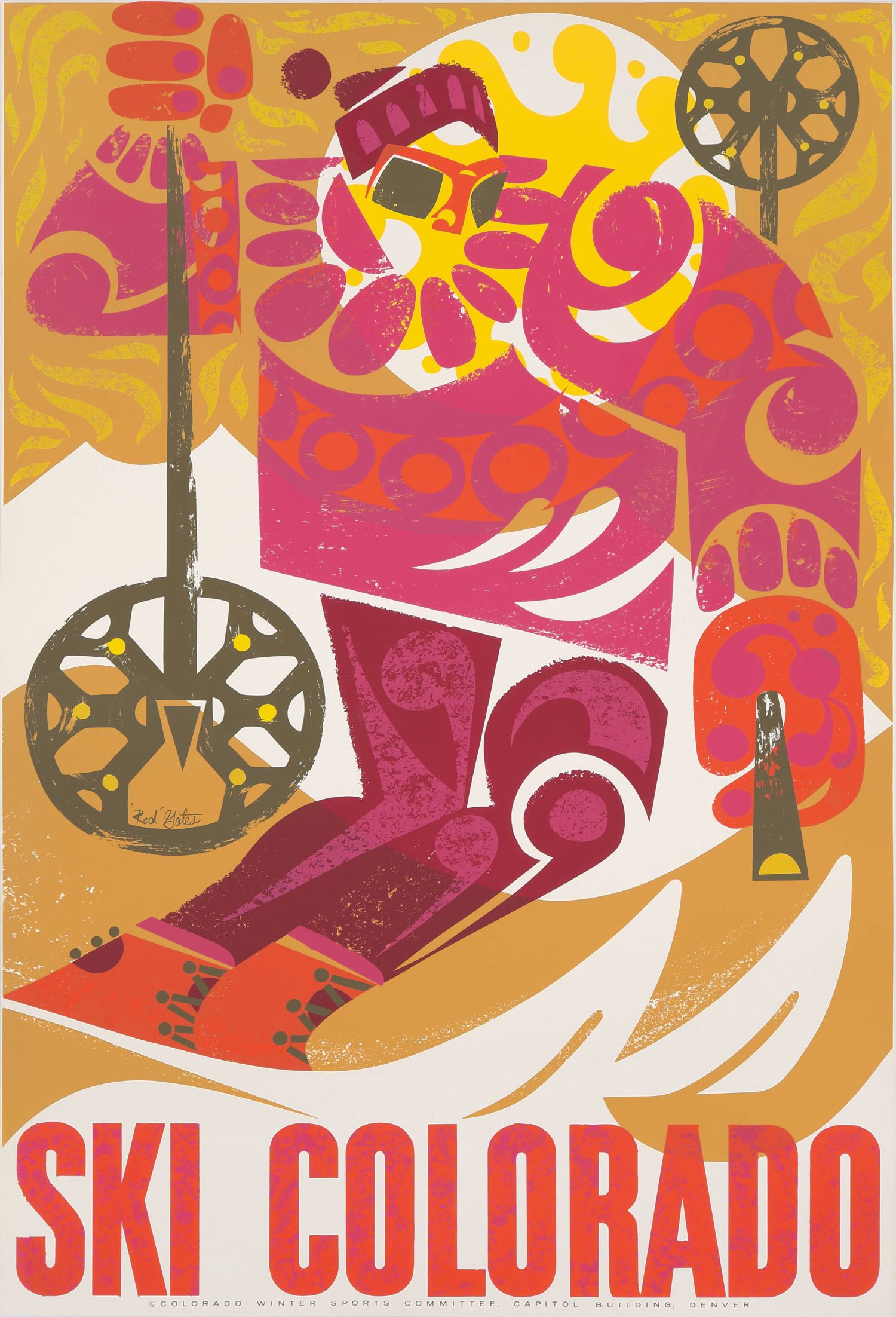 La pieza, es obra del artista M. G. Whittingham, destaca por su diseño modernista y está realizada mediante serigrafía con seis colores. Su propósito era claro: atraer a turistas a las florecientes estaciones de esquí de Colorado, presentándose como una obra clave en la publicidad de deportes de invierno de la época.