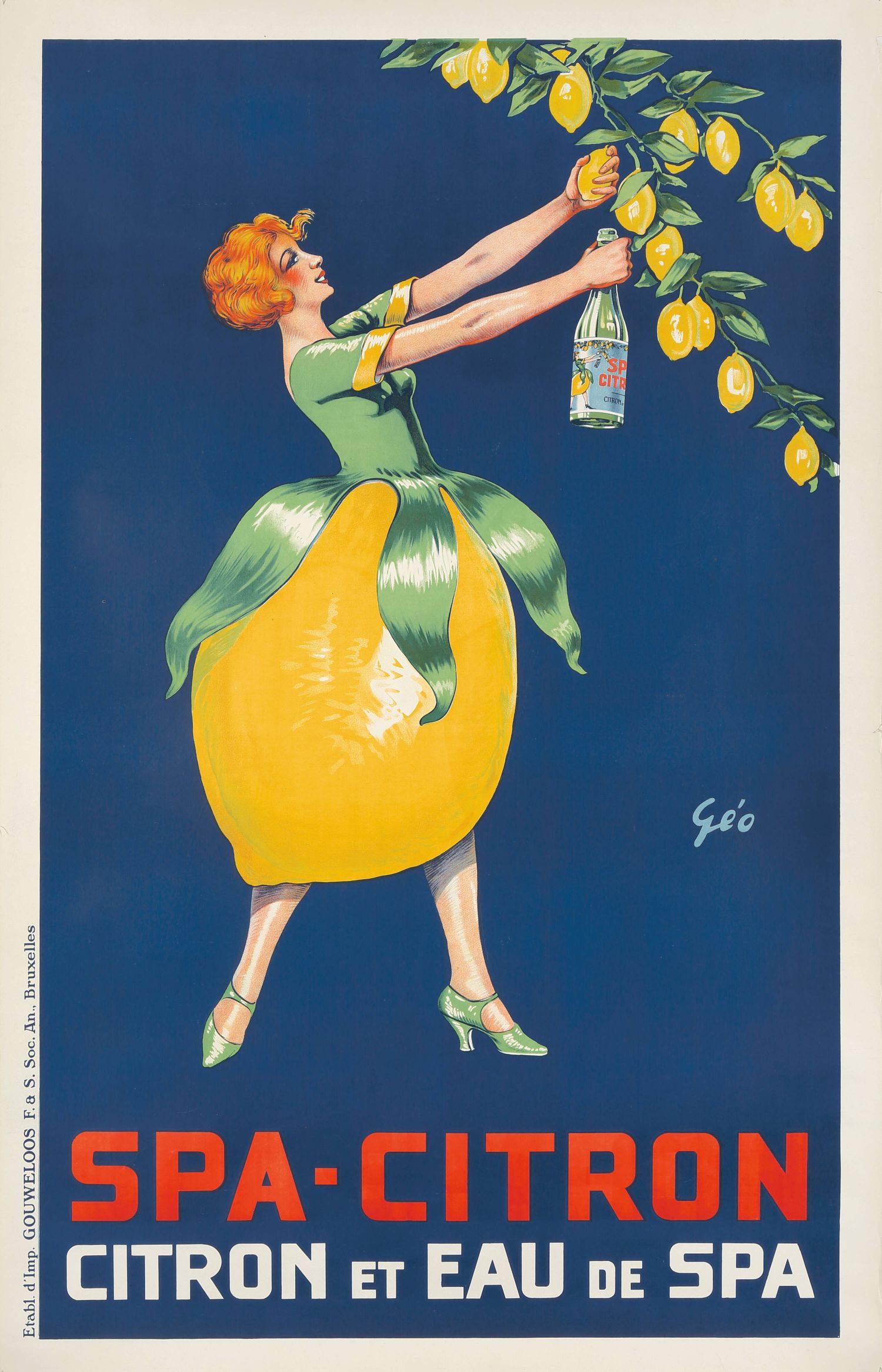 Este encantador y divertido póster publicitario vintage de "Spa-Citron", diseñado por Géo (François Géo, 1880-1968) alrededor de 1925, promociona esta bebida de limón y agua mineral de la famosa ciudad de Spa, Bélgica. La impresión fue realizada por Etabl. d'Imp. GOUWELOOS F.a S. Soc. An. Bruxelles.
