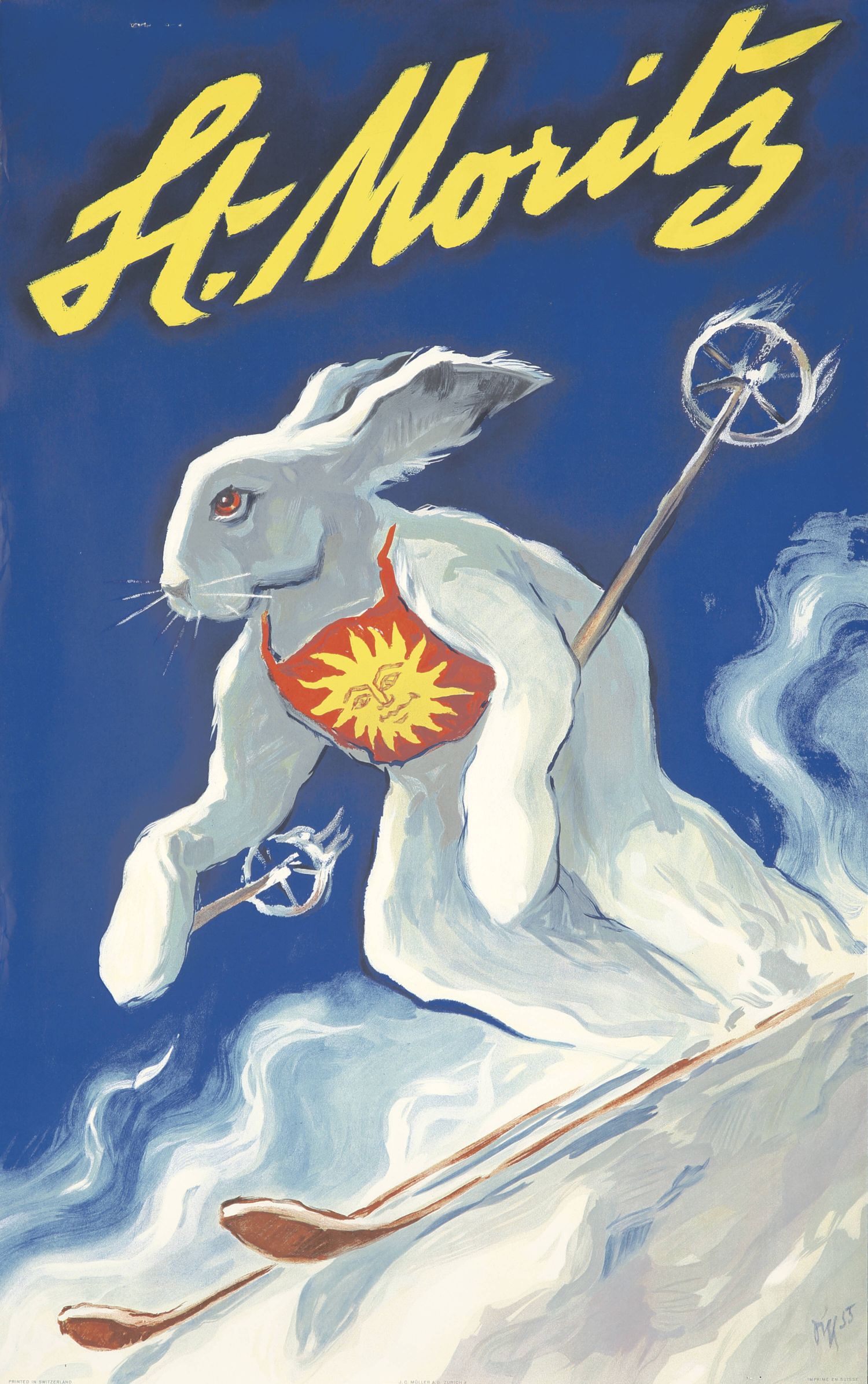 Póster de esquí vintage de Emil Cardinaux (1877-1936) promocionando St. Moritz, Suiza, un reconocido centro turístico en los Alpes suizos. La obra presenta un conejo blanco esquiando que lleva un chaleco con un sol, simbolizando la reputación soleada de St. Moritz.