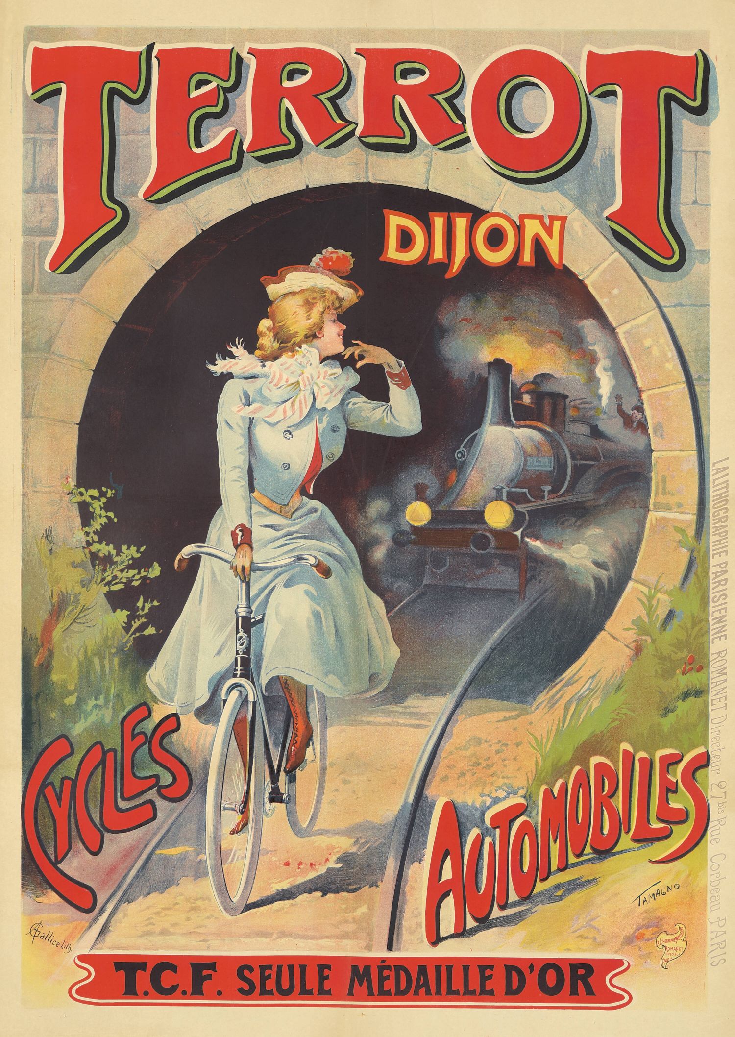 Ejemplo del estilo Art Nouveau, muestra a una mujer elegante en bicicleta superando a un tren, simbolizando modernidad y velocidad. Terrot, de Dijon, Francia, fabricaba bicicletas, motocicletas y automóviles. El cartel destaca su "T.C.F. Seule Médaille d'Or" (única medalla de oro del Touring Club de France).