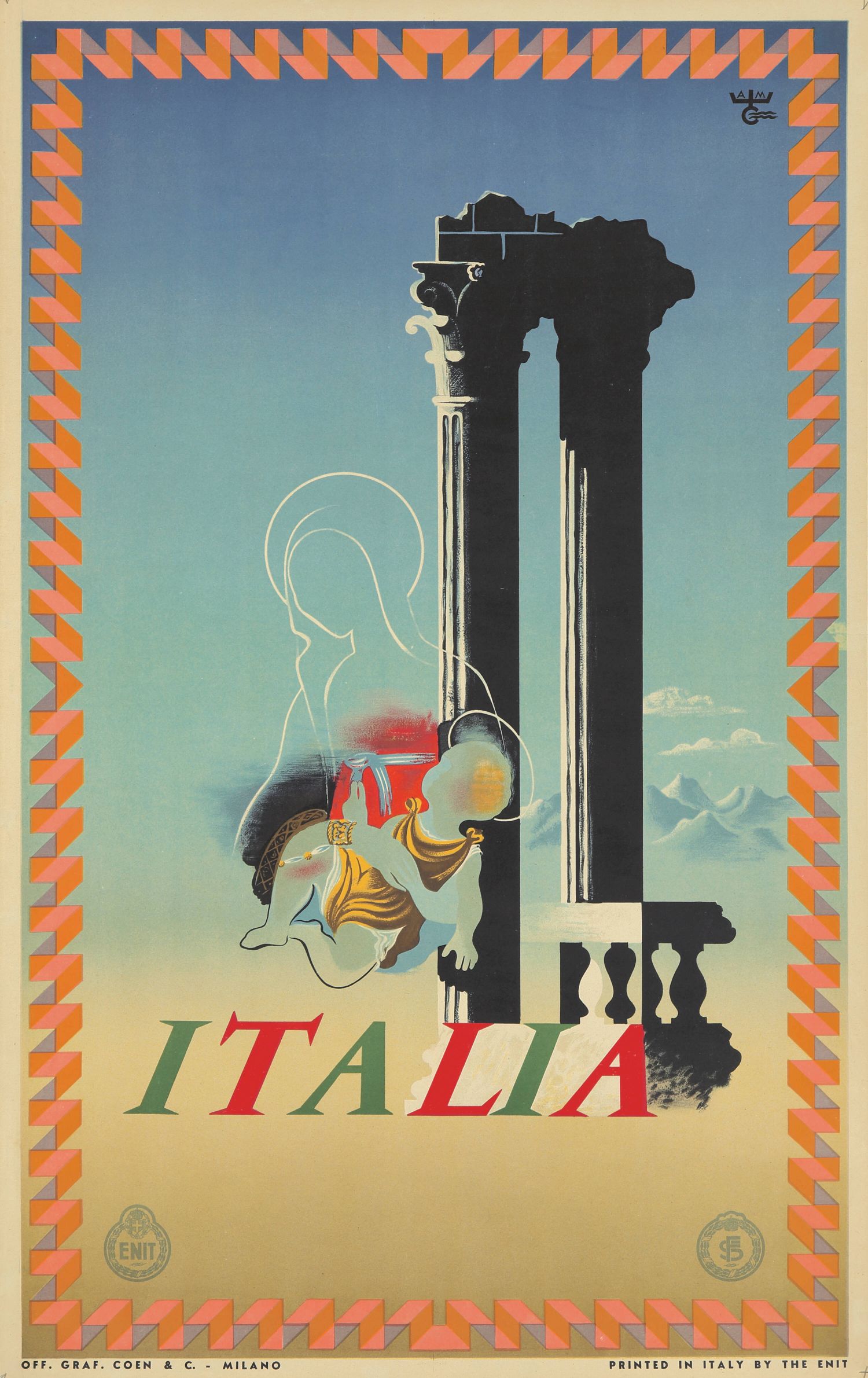 Este cartel vintage diseñado por Adolphe Mouron Cassandre (1901-1968), buscó promocionar a Italia, como destino turístico mostrando una combinación de elementos antiguos, y modernos, además de la palabra "Italia" en la parte inferior.