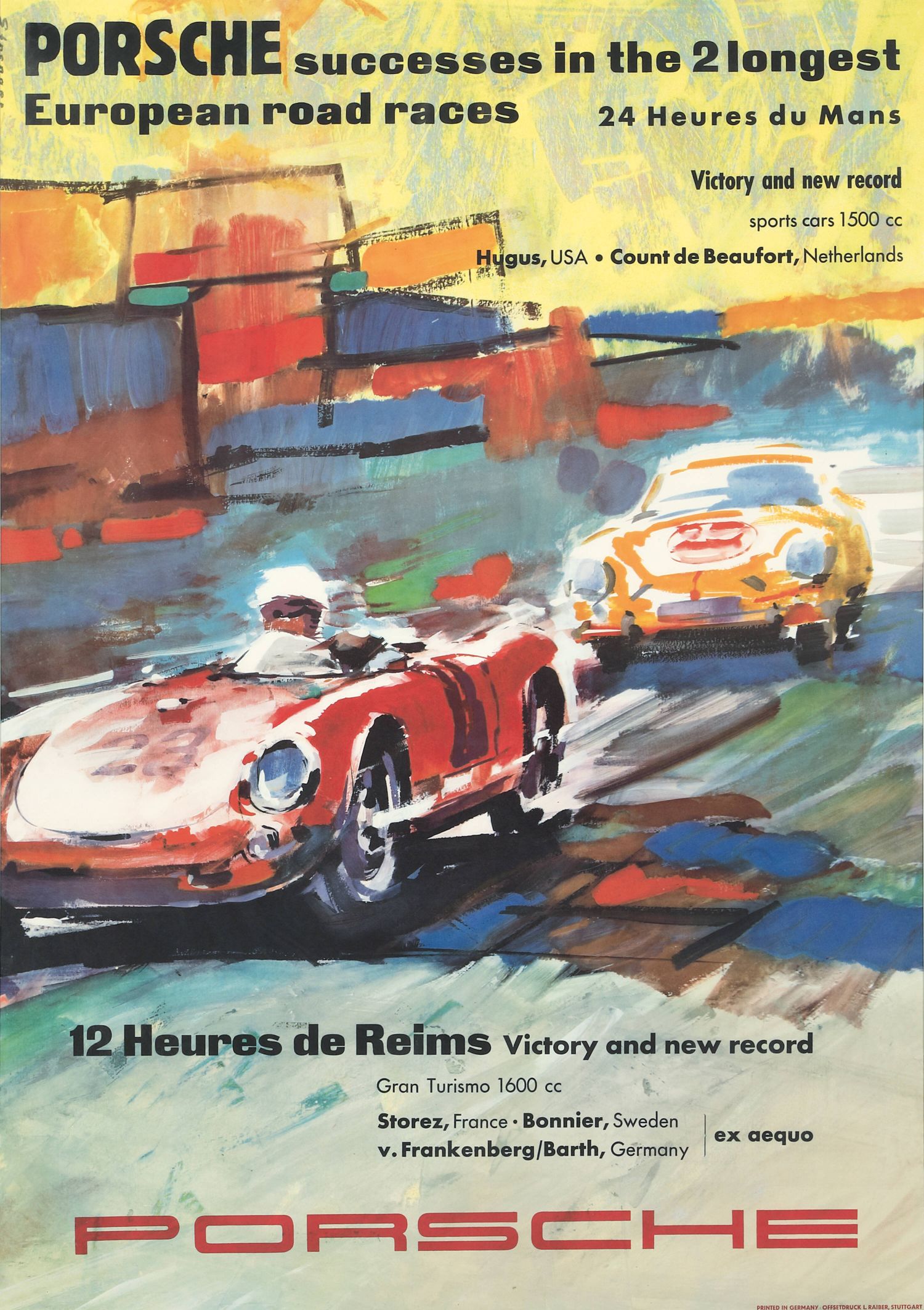 Esta imagen es un póster que celebra los éxitos de Porsche en dos de las carreras de carretera europeas más largas: las 24 Horas de Le Mans y las 12 Horas de Reims.