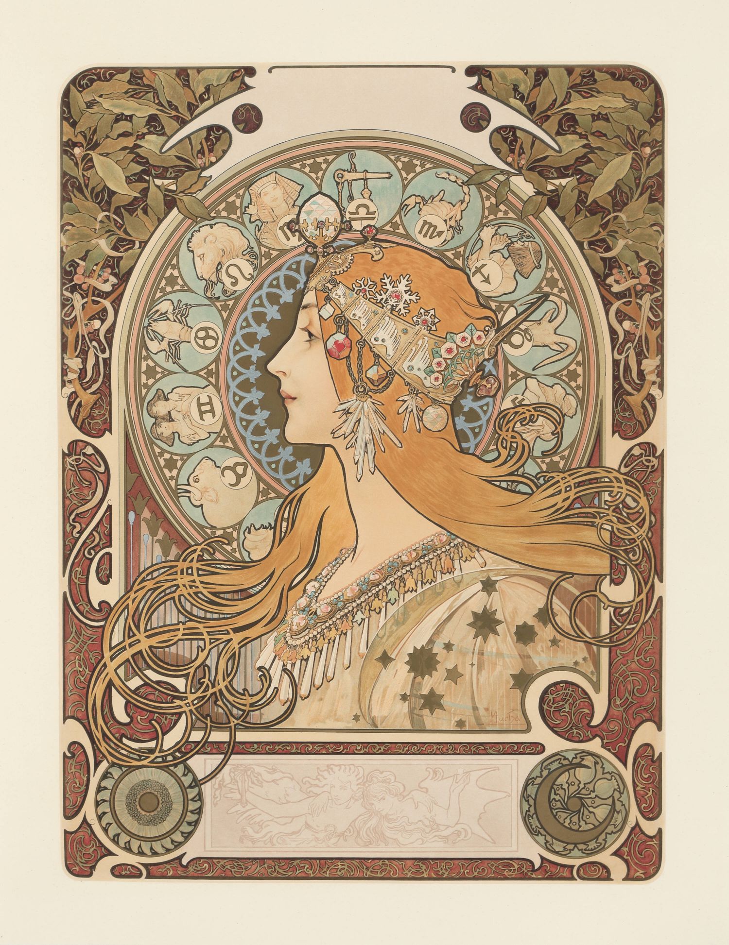 Esta imagen corresponde a la litografía "Zodiac" del artista checo Alphonse Mucha (1860-1939), una obra icónica del movimiento Art Nouveau. Originalmente diseñada como un calendario interno para la imprenta Champenois en 1896, su llamativo diseño llevó a que fuera distribuida como el calendario de la revista La Plume en 1897.